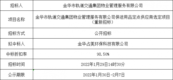金華市軌道交通集團(tuán)物業(yè)管理服務(wù)有限公司保潔用品定點(diǎn)供應(yīng)商選定項(xiàng)目的中標(biāo)公示